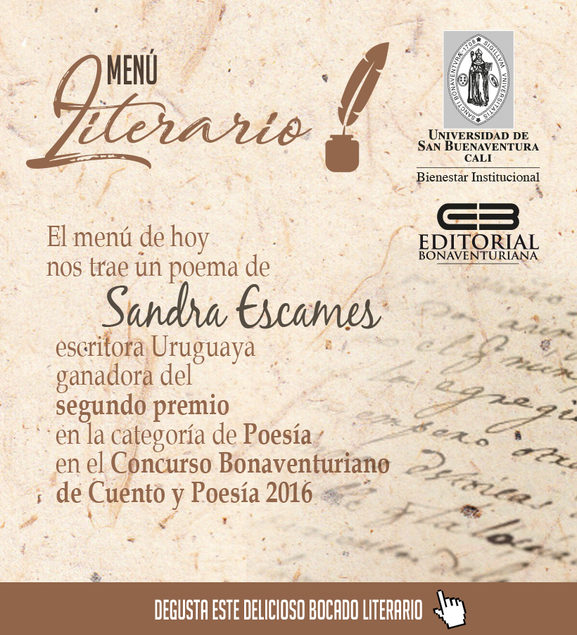 Mención en varios concursos literarios, entre ellos los Premios Anuales de Literatura, por el Ministerio de Educación y Cultura de Uruguay (MEC) en el año 1999, categoría teatro infantil, obra Un aplauso para Meche. Concurso Juan Carlos Onetti, Intendencia de Montevideo, en el año 2015, categoría novela infantil y juvenil, obra Supertí@. Primera Mención en el Concurso Juan Carlos Onetti (Intendencia de Montevideo), en la Categoría Narrativa Infantil y juvenil En esta ocasión, Sandra es nuestra invitada y nos presenta el poema ganador del segundo premio en la categoría de poesía, en el Concurso bonaventuriano de cuento y poesía 2016.
